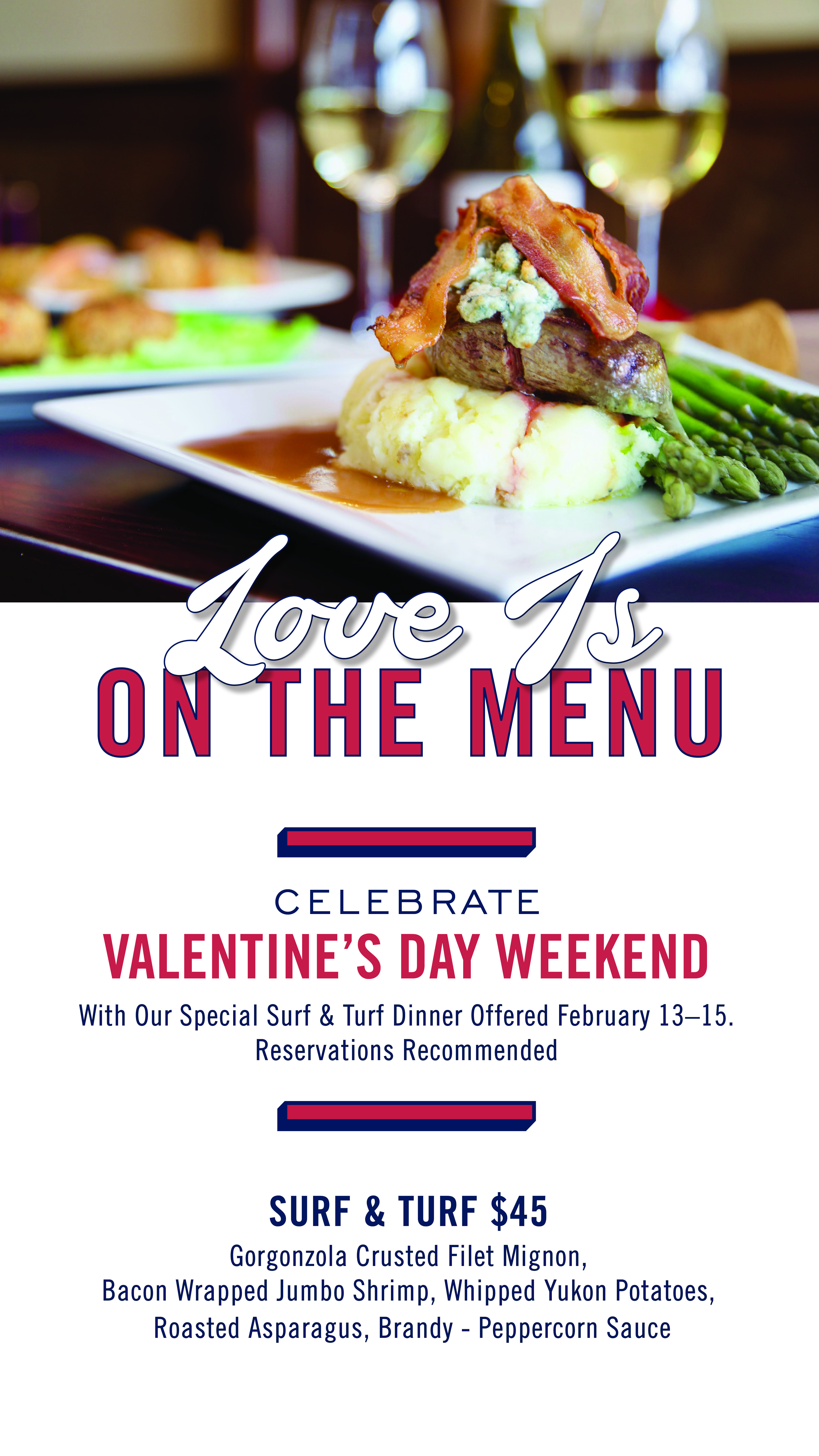 Celebrate Valentine’s day weekendWith Our Special Surf & Turf Dinner Offered February 13–15.