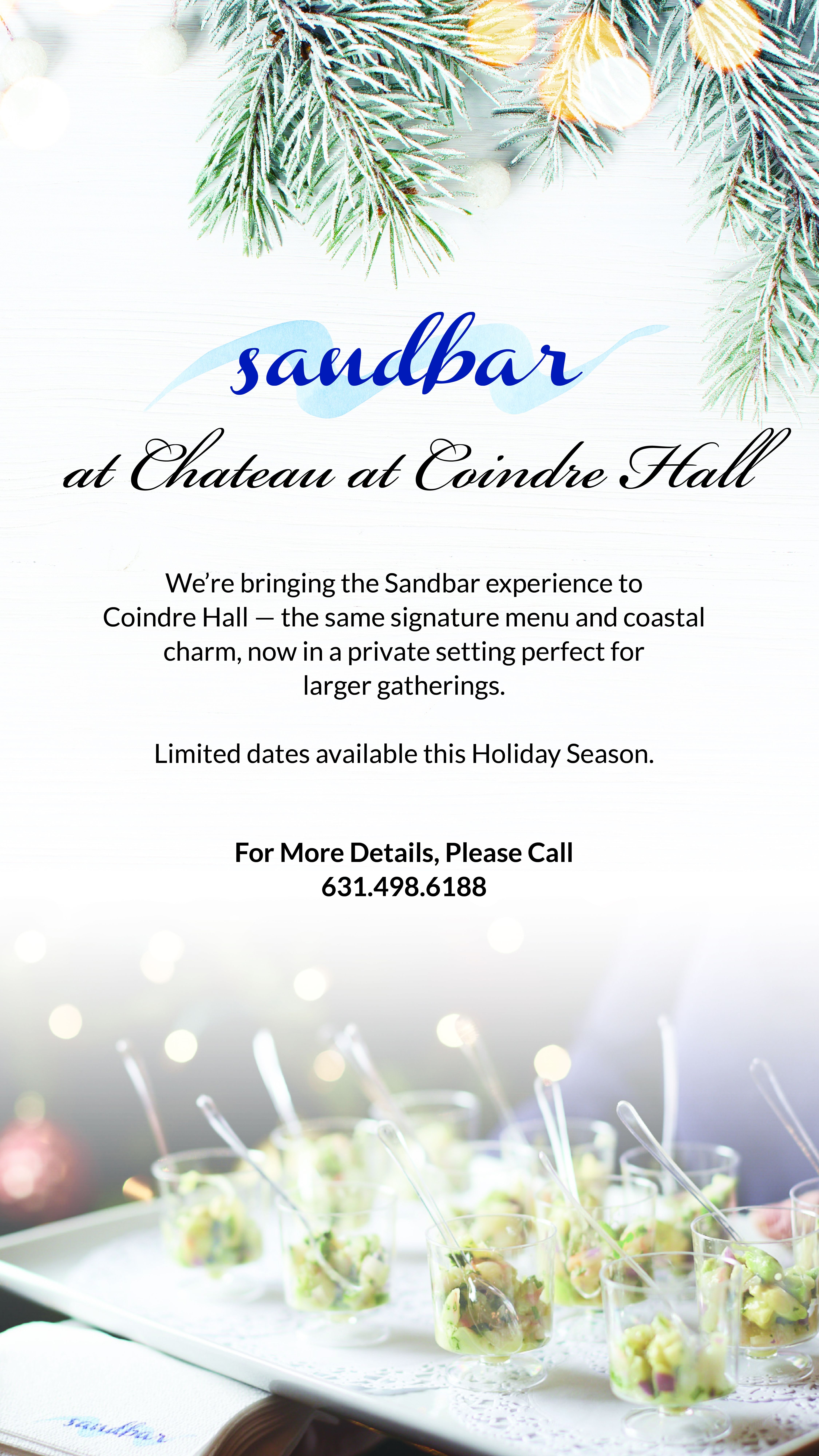 We’re bringing the Sandbar experience to Coindre Hall — the same signature menu and coastal charm, now in a private setting perfect for larger gatherings.