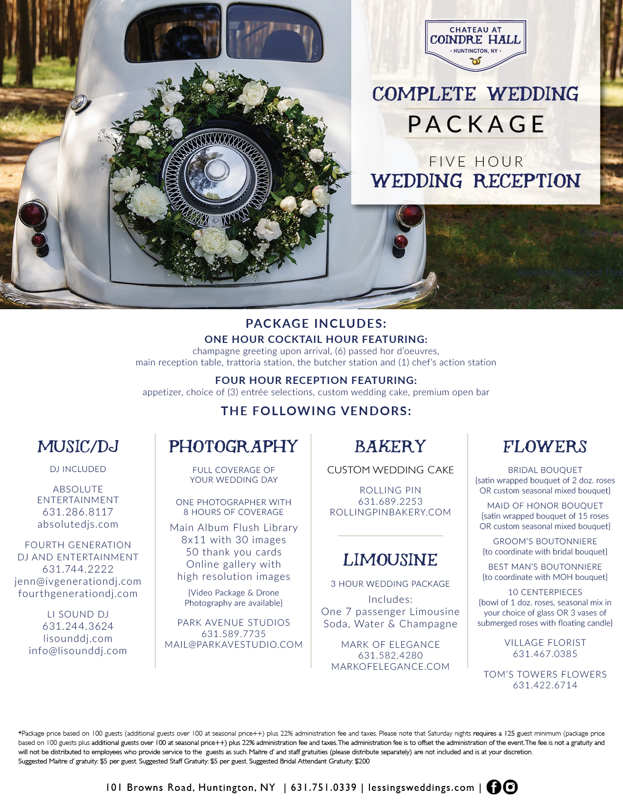 appetizer, choice of (3) entrée selections, custom wedding cake, premium open bar